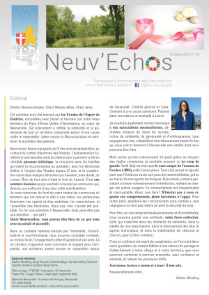 Vous retrouverez dans le Neuv'Echos toutes les actualités de la Commune : événements, vie associative, projets de la Municipalité, aménagements et travaux, etc...