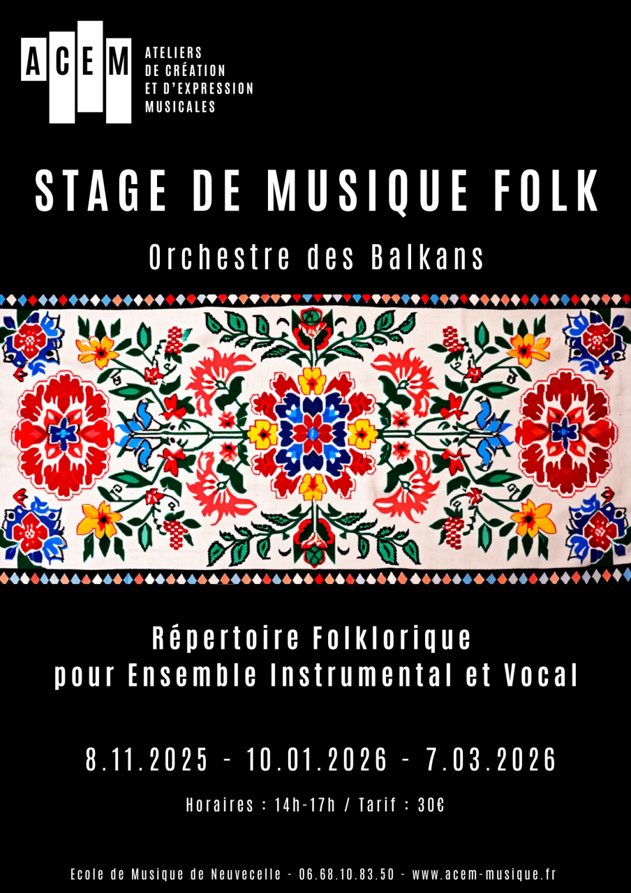 Ouvert à tous les musiciens, chanteurs ou instrumentistes (violon, guitare, flute, clarinette, accordéon, percussions, etc.), ce stage vous propose d'aborder le répertoire des orchestres traditionnels balkaniques (Grèce, Macédoine, Bulgarie, Bosnie, etc.) à travers l’étude de mélodies, de chants et de rythmes essentiels.