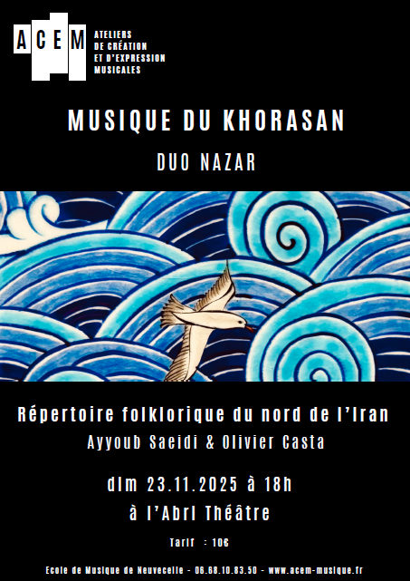 L'ACEM, l’école de Musique de Neuvecelle, accueille l'artiste iranien Ayyoub Saeidi pour un Concert exceptionnel, à l'Abri Théâtre, le dimanche 23 novembre à 18h.