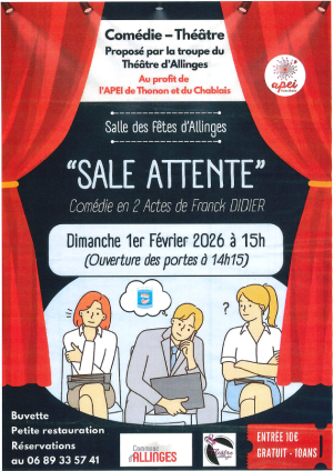 La troupe de Théâtre d'Allinges vous propose une Comédie - Théâtre au profit de l'APEI de Thonon et du Chablais le Dimanche 1er février à 15h00 (ouverture des portes 14h30)