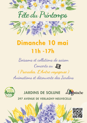Venez fêter le printemps aux Jardins de Solune ! De 11h30 à 13h30 "Lire et Faire lire" fera découvrir des lectures inspirantes aux plus jeunes. Stands massage, maquillage, artisanat local, vente de plants d’agastaches... Buvette avec petite restauration en continu. Et deux fabuleux concerts pour entrer dans la nouvelle saison : "Psarades", musique folk des Balkans (oud, voix, accordéon, percussions) à 13h30 et "L’Antre voyageuse" (handpan, flûte traversière, violoncelle, didjeridoo) à 15h30. Entrée libre.